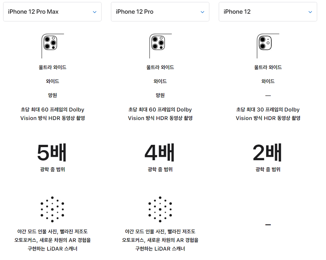 아이폰12 프로맥스 ,아이폰12 프로, 아이폰12 (기본) 비교