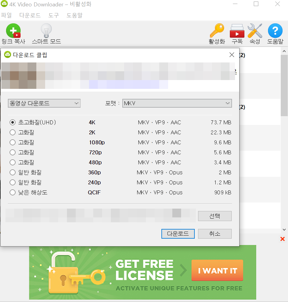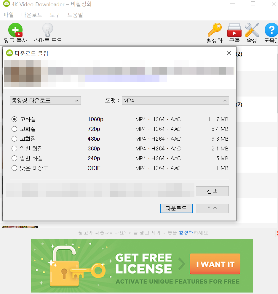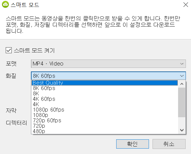 * 스마트 모드 활성화 하면 본인이 설정한 값으로 화질 선택 단계 없이 자동으로 다운로드 되요.