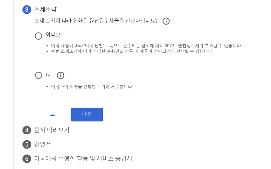 5. 미국 세금 정보 나오면 세금정보 추가 파란 버튼 클릭