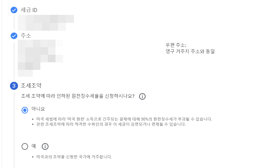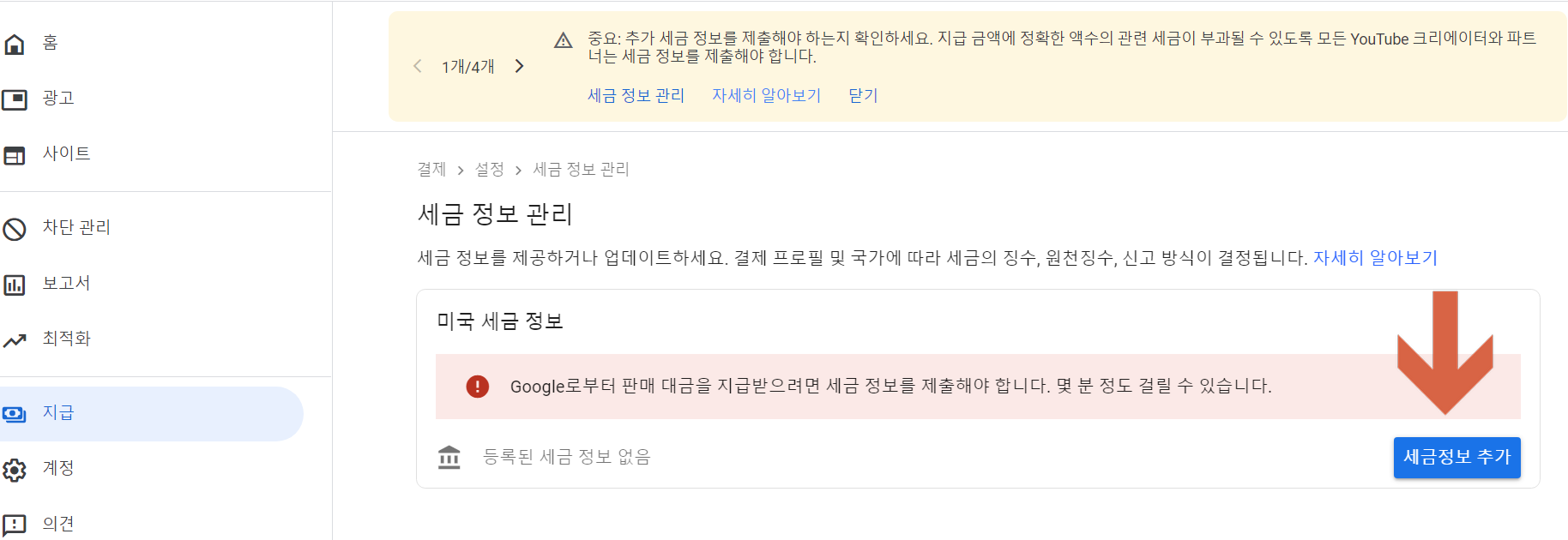 애드센스에 들어가면 현재 유튜브 세금정보 제출로 별도의 상단 바를 만들어놨어요. 거기 클릭해서 들어가서 작성하시면 됩니다.