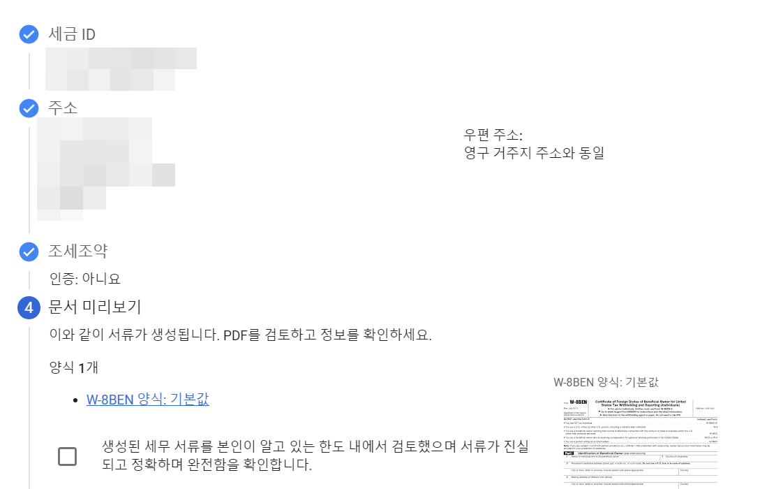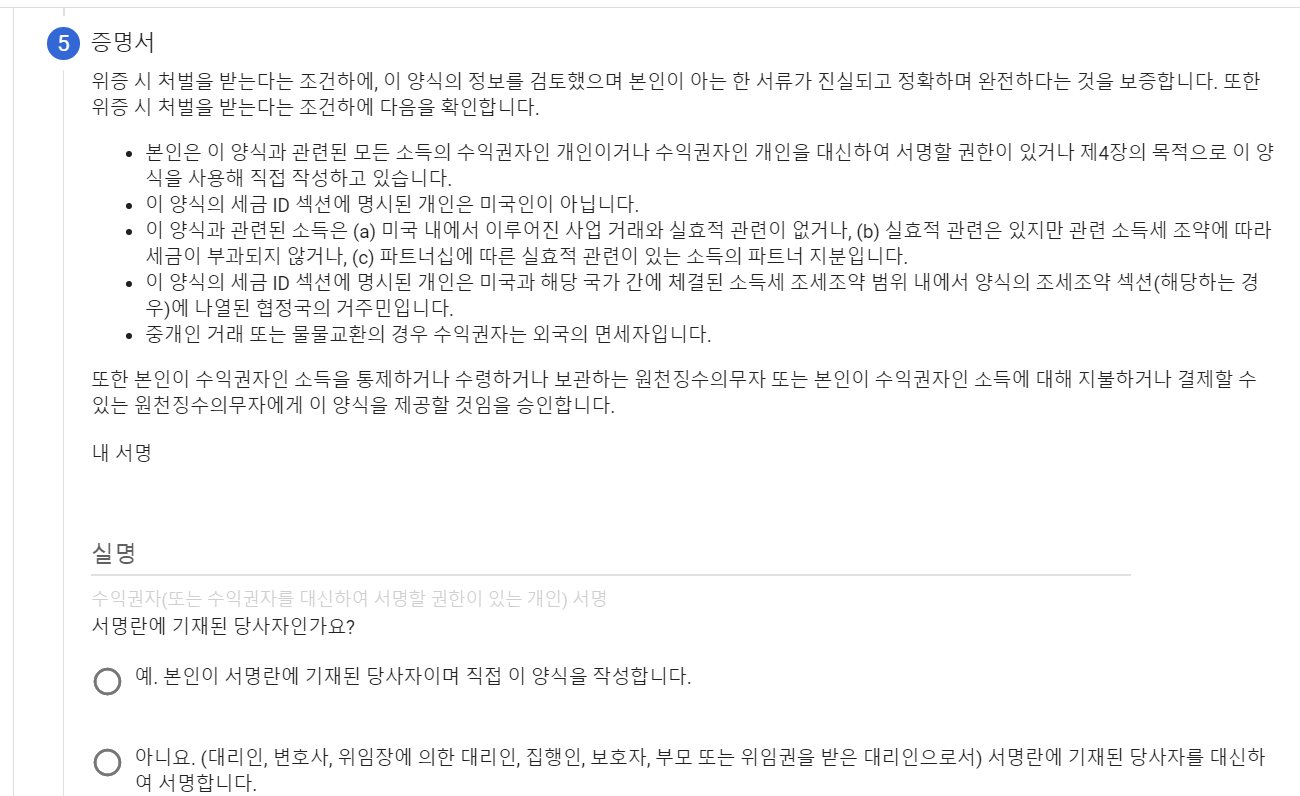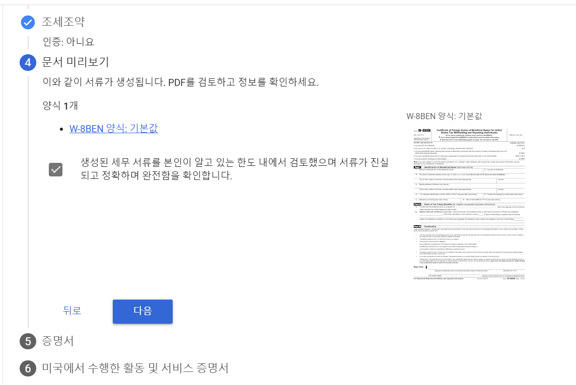 다 입력 했으면 W-8BEN양식으로 이동 한다.