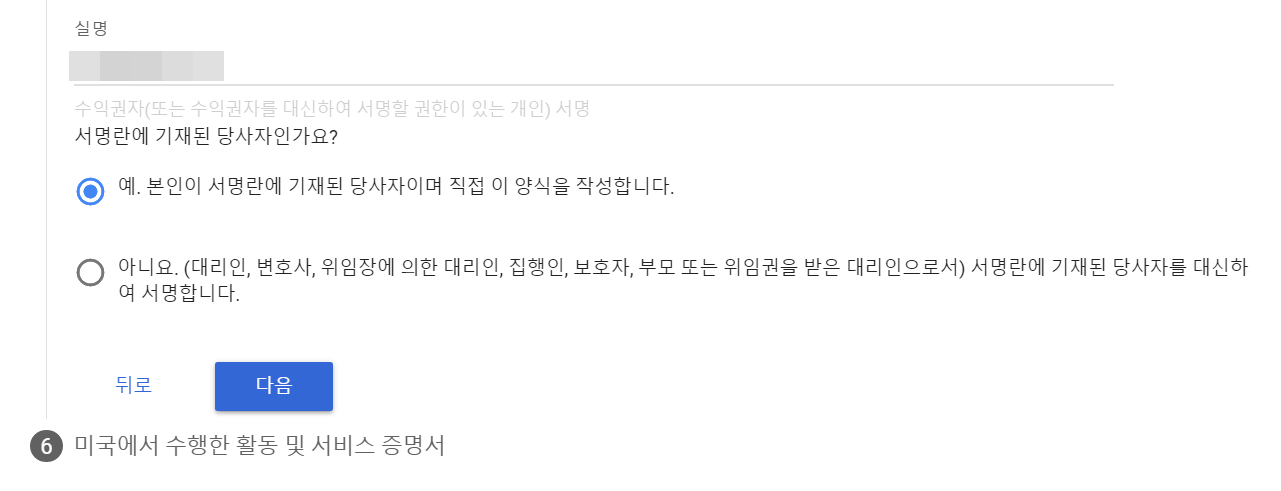 위에 작성한 이름과 동일하게 적고 서명란에 기재한 사람 본인일 경우 본인란 선택한 후 다음