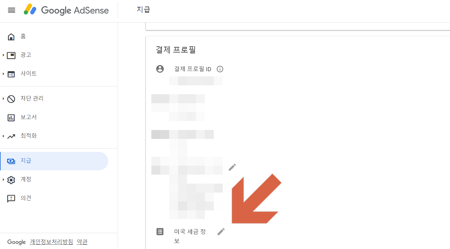 3. 하단으로 살짝 내리면 나오는 결제 프로필란의 미국 세금정보 연필 모양 아이콘 클릭