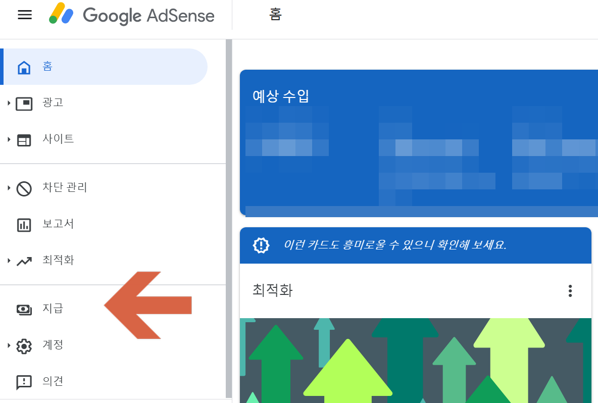 1. 구글 애드센스 홈페이지에 가서 좌측 메뉴 중 지급 메뉴 클릭