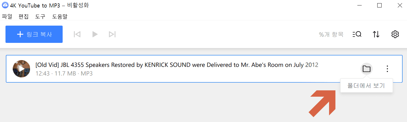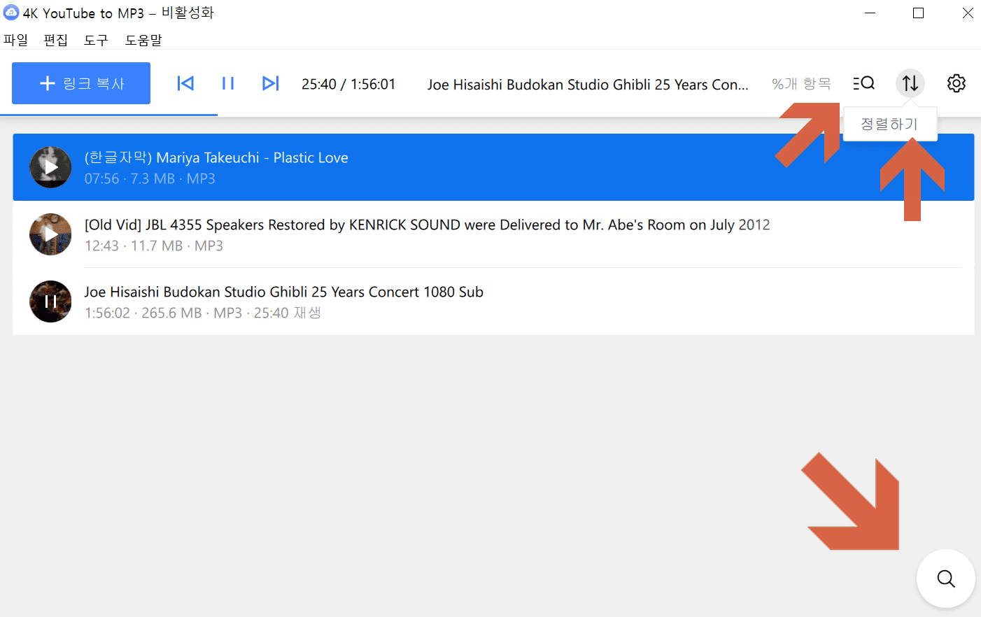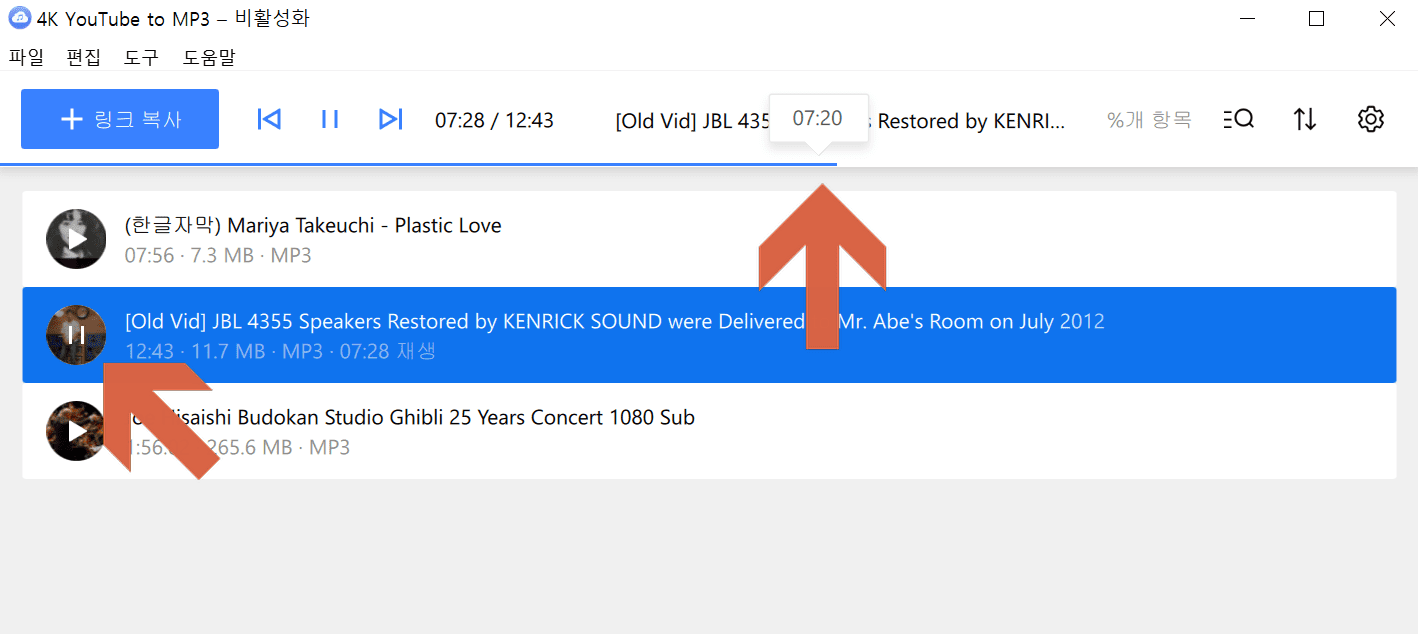 ✔ 마지막으로 4K YouTube to MP3프로그램 내에서 바로 듣기를 할 수 있어요.
