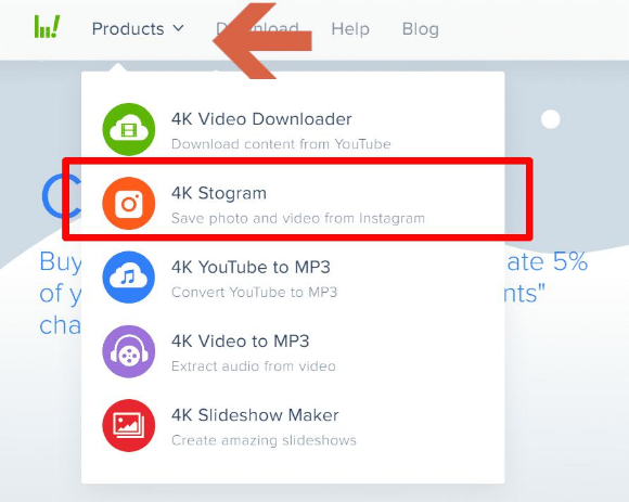 2. 상단 메뉴 중 products 클릭한 후  4K stogram을 선택한다. (무료 다운로드)