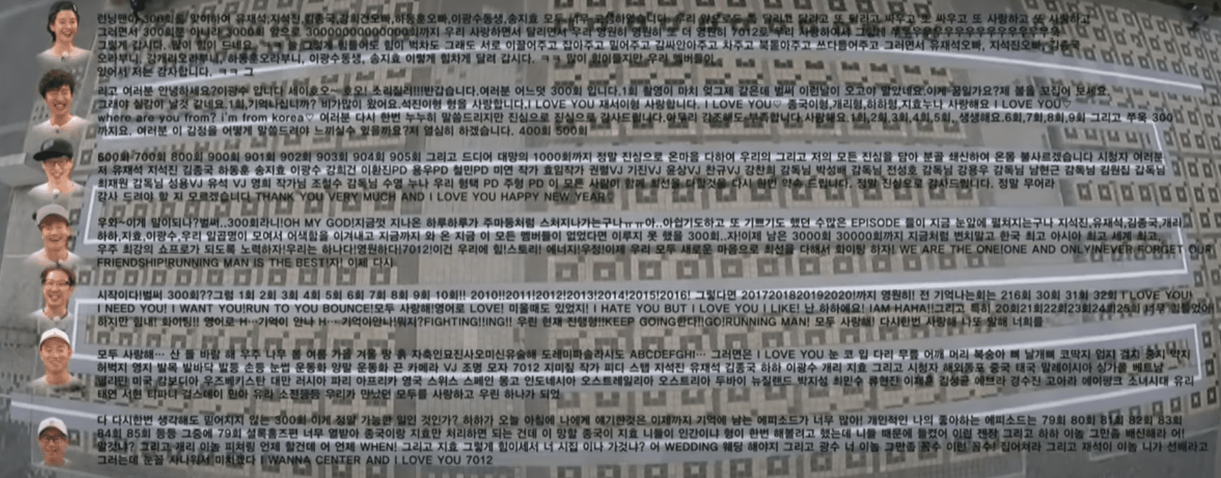 우와~이게 말이 되나? 벌써..300회라니!OH MY GOD!지금껏 지나온 하루하루가 주마등처럼 스처지나가는구나ㅠㅠ아..아쉽기도하고 기쁘기도 했던 수많은 EPISODE 들이 지금 눈앞에 펼쳐지는구나 지석진,유재석,김종국,개리,하하,지효,이광수,우리 일곱명이 모여서 어색함을 이겨내고 지금까지 지금 모든 멤버들이 없었다면 이루지 했을 30..!이제 남은 3000 30000회까지 지금처럼 변치말고 한국 최고 아시아 최고 세계 최고, 우주 최강의 쇼프로가 되도록 노력하자!우리는 하나다!영원하다!7012!이건 우리에 !스토리! 에너지!우정!이제 우리 모두 새로운 마음으로 최선을 다해서 파이팅 하자! WE ARE THE ONE!ONE AND ONLY!NEVER FORGET OUR FRIEDNSHIP!RUNNING MAN IS THE BEST!! 이제 다시