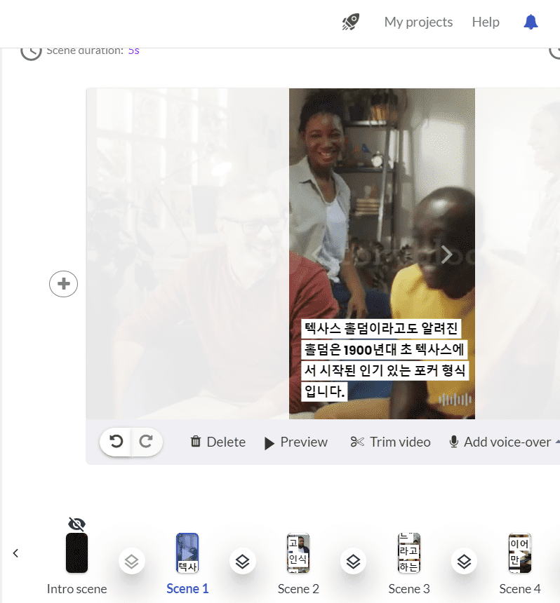 텍스트 (스크립트)를 입력하고 몇가지 선택(템플릿 스타일과 화면 사이즈) 하면 인공지능이 자동으로 동영상을 완성 시켜줍니다.